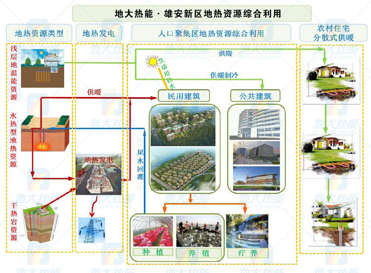 地大熱能地熱+多能互補網訊:雄安新區是我國中東部地熱資源開發利用條件最好的地區,位于冀中坳陷中部凸起區,平面上分為容城、高陽和雄縣3個地熱田,地熱田面積覆蓋新區80%以上,具有儲量大、埋藏深度適中、溫度高、水質優、易回灌的特點。地大熱能-雄安新區地熱清潔能源綜合利用示意圖如圖1所示。