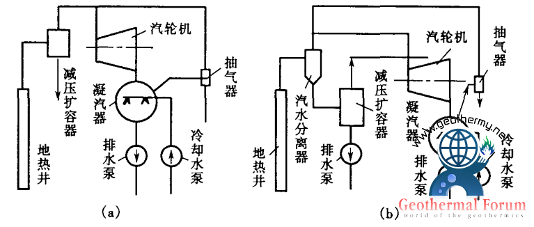 閃蒸地熱發(fā)電系統(tǒng)是一種比較適用于中低溫地熱水發(fā)電的系統(tǒng)(又稱“減壓擴容法”),圖1所示為這種系統(tǒng)的流程圖。來自地熱井的熱水首先進入閃蒸器(減壓擴容器)(圖1-a),容器內(nèi)維持著比熱水壓力低的壓力,因而部分熱水得以閃蒸并將產(chǎn)生的蒸氣送往汽輪機膨脹做功發(fā)電。如地熱井口流體是濕蒸氣(圖1-b),則先進入汽水分離器,分離出的蒸氣送往汽輪機做功發(fā)電,分離剩余的水再進入閃蒸器,閃蒸后得到的閃蒸蒸氣也送往汽輪機做功。