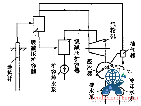 地熱田所提供的地熱蒸氣或熱水的參數(shù)(溫度、壓力),相對于常規(guī)火電廠的參數(shù)來說都是很低的,地熱發(fā)電的效率也遠低于火力發(fā)電。因此,如何最大限度地利用地熱能量,尤其是對濕蒸氣田和熱水田更是突出的問題。采用多級閃蒸系統(tǒng),就是一種有效利用地熱能量的方法。
