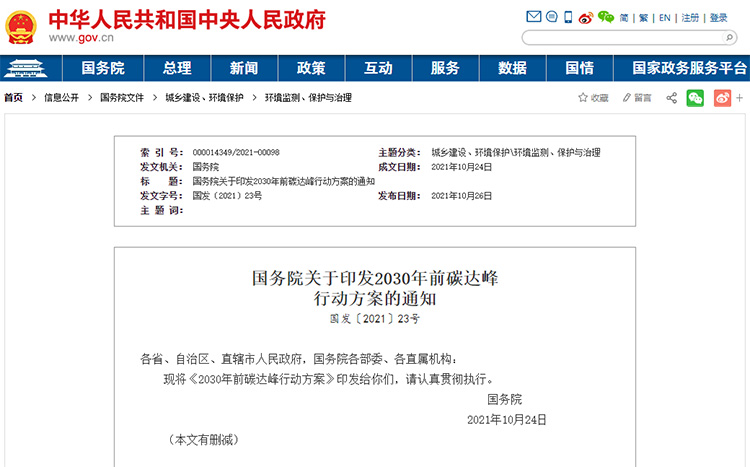 現(xiàn)將《2030年前碳達峰行動方案》印發(fā)給你們,請認真貫徹執(zhí)行。