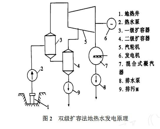 西南電力設(shè)計院設(shè)計的羊八井地?zé)?/a>電站第1臺試驗機(jī)組,容量為1000kW,汽輪機(jī)是利用四川內(nèi)江電廠2500kW廢棄設(shè)備改造而成。于1977年10月試運成功,采用單級擴(kuò)容法熱力系統(tǒng)。若把地?zé)崴?/a>送入1個密閉的容器中降壓、擴(kuò)容,根據(jù)水沸點與壓力的關(guān)系,可使溫度不太高的地?zé)?/a>水因氣壓降低而沸騰變成蒸汽。由于地?zé)?/a>水降壓蒸發(fā)的速度很快,是一種閃急蒸發(fā)過程;同時,地?zé)崴?/a>蒸發(fā)產(chǎn)生蒸汽時,其體積迅速擴(kuò)大,所以該容器稱為“擴(kuò)容器”或“閃蒸器”。用這種方法產(chǎn)生蒸汽來發(fā)電稱為擴(kuò)容法地?zé)崴?/a>發(fā)電。這是利用地?zé)崽?/a>熱水發(fā)電的主要方式之一,該方式分單級擴(kuò)容法系統(tǒng)和雙級(或多級)擴(kuò)容法系統(tǒng)。擴(kuò)容法系統(tǒng)的原理是:將地?zé)峋?/a>來的中溫地?zé)?/a>汽、水混合物,先送到擴(kuò)容器中進(jìn)行降壓、擴(kuò)容(稱閃蒸),使其產(chǎn)生部分蒸汽,蒸汽經(jīng)過分離器除去雜質(zhì)(10μm及以上)后,再引到常規(guī)汽輪機(jī)機(jī)發(fā)電。